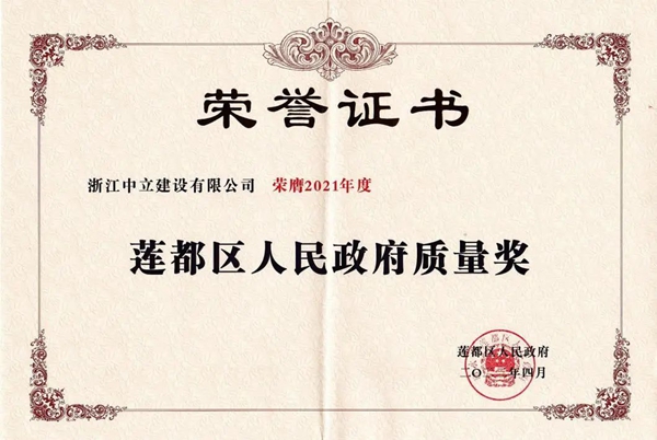 為增強(qiáng)全社會(huì)質(zhì)量意識(shí),引導(dǎo)和激勵(lì)全區(qū)各行各業(yè)加強(qiáng)質(zhì)量管理,促進(jìn)轉(zhuǎn)型升級(jí),帶動(dòng)高質(zhì)量發(fā)展,根據(jù)《蓮都區(qū)人民政府質(zhì)量獎(jiǎng)管理辦法》(蓮政辦發(fā)〔2021〕49 號(hào))規(guī)定,經(jīng)嚴(yán)格評(píng)審,決定授予浙江中立建設(shè)有限公司“2021年蓮都區(qū)人民政府質(zhì)量獎(jiǎng)”。